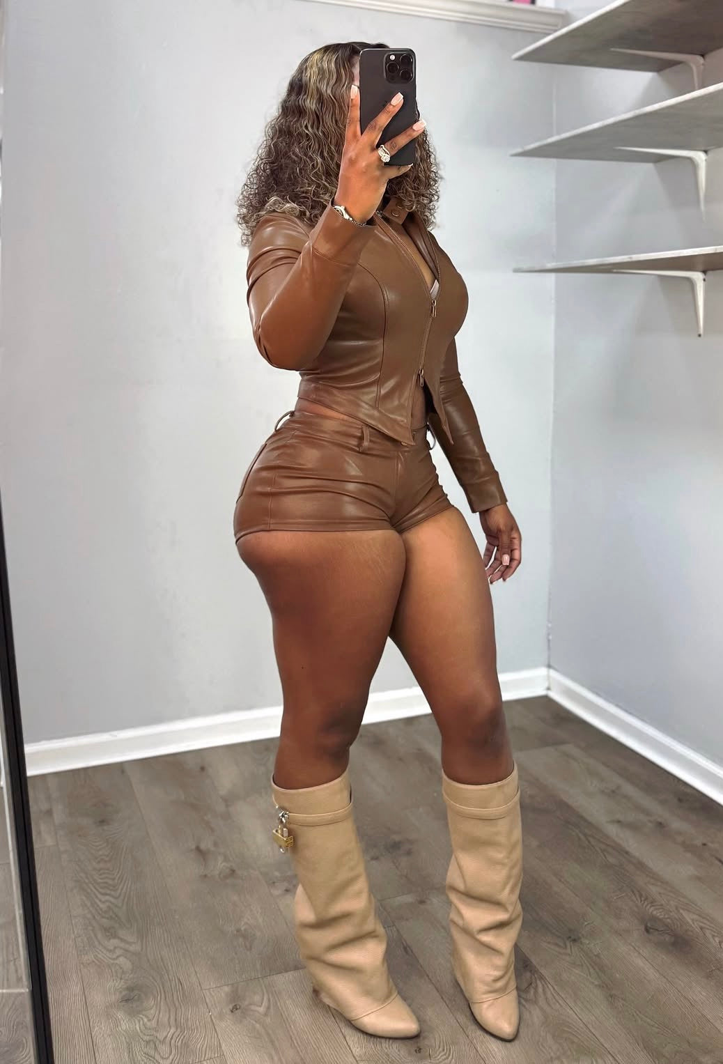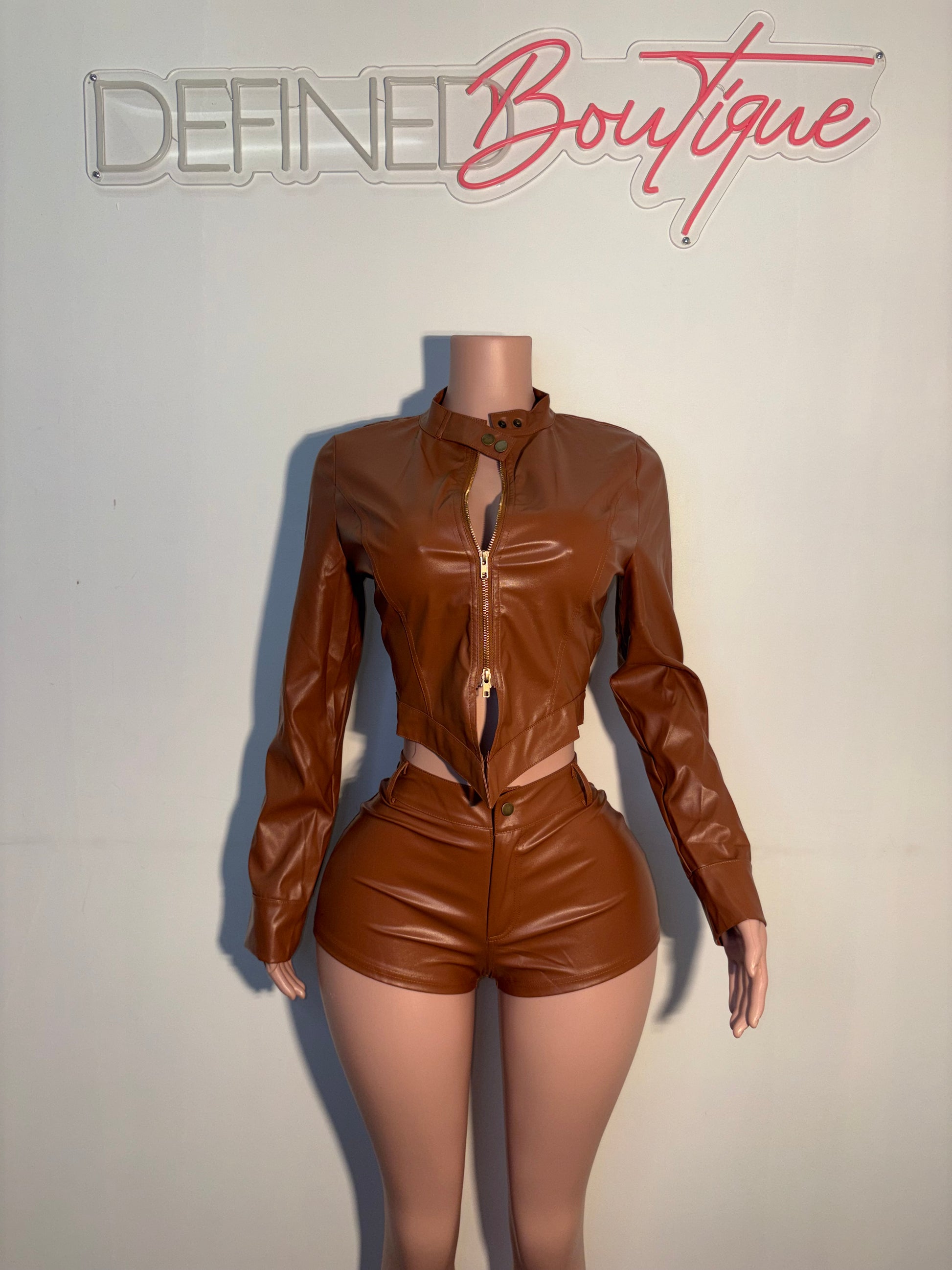 Faux leather motorcycle set - stand collar two-way zip crop jacket & skinny shorts, cyberpunk biker shorts outfit, edgy two-piece outfit.
