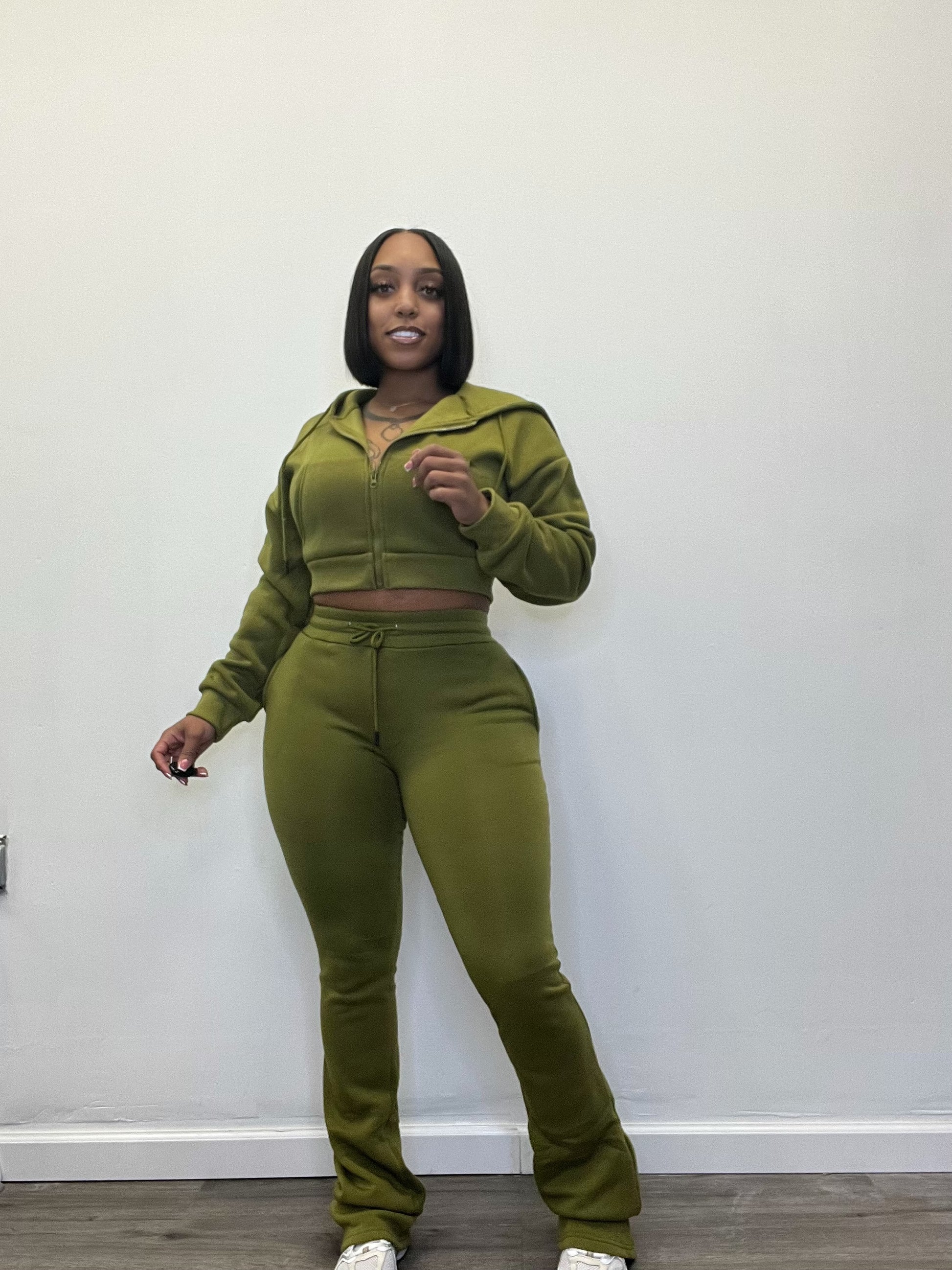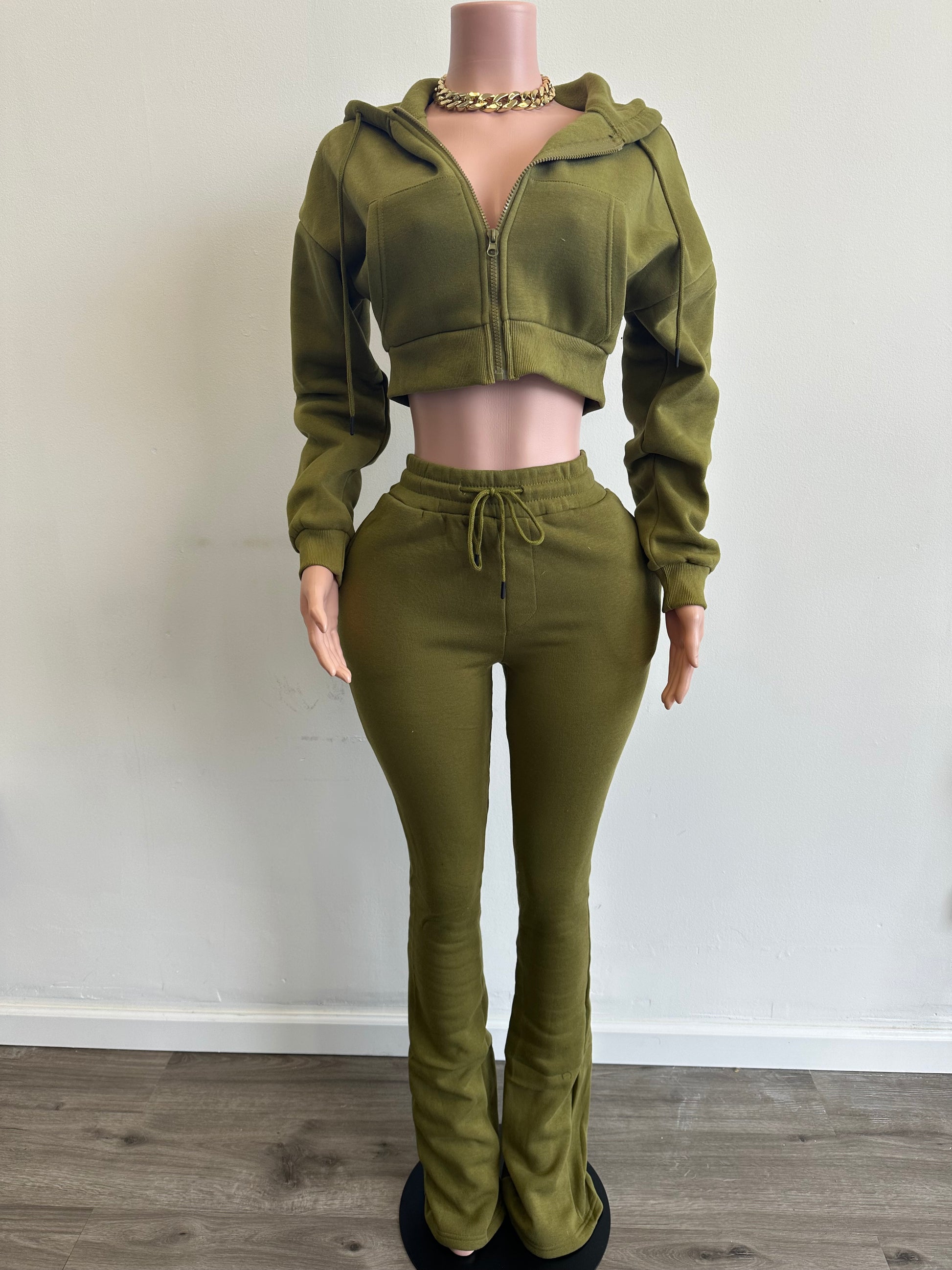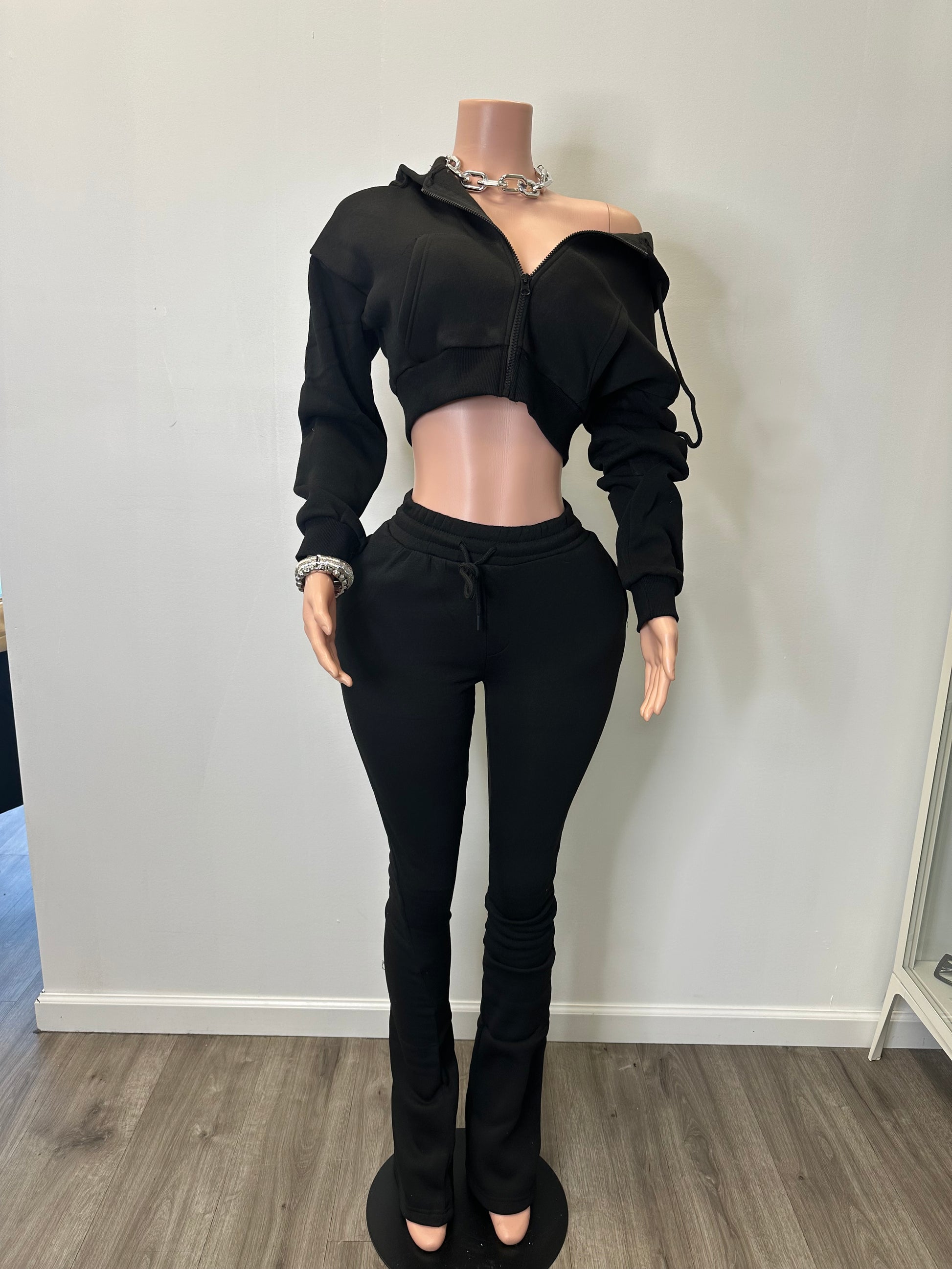 CROP HOODIE ZIP UP & LONG STACKED PANTS.
