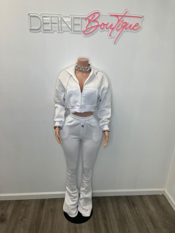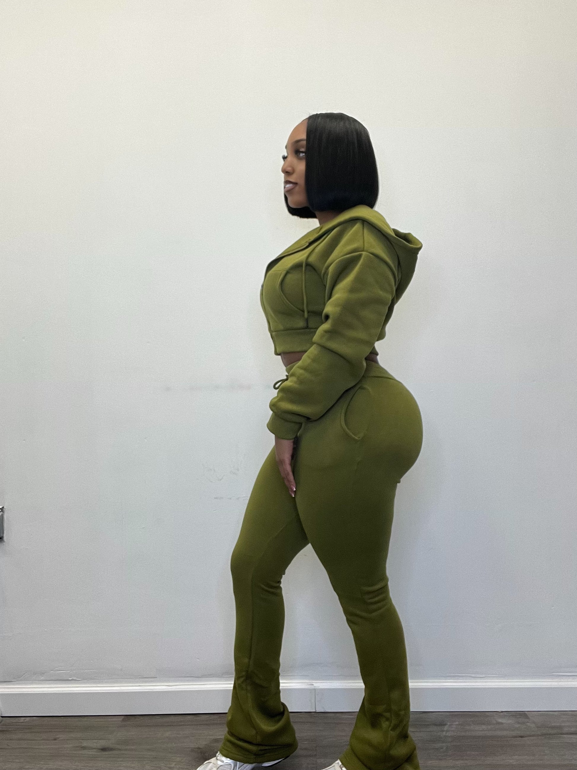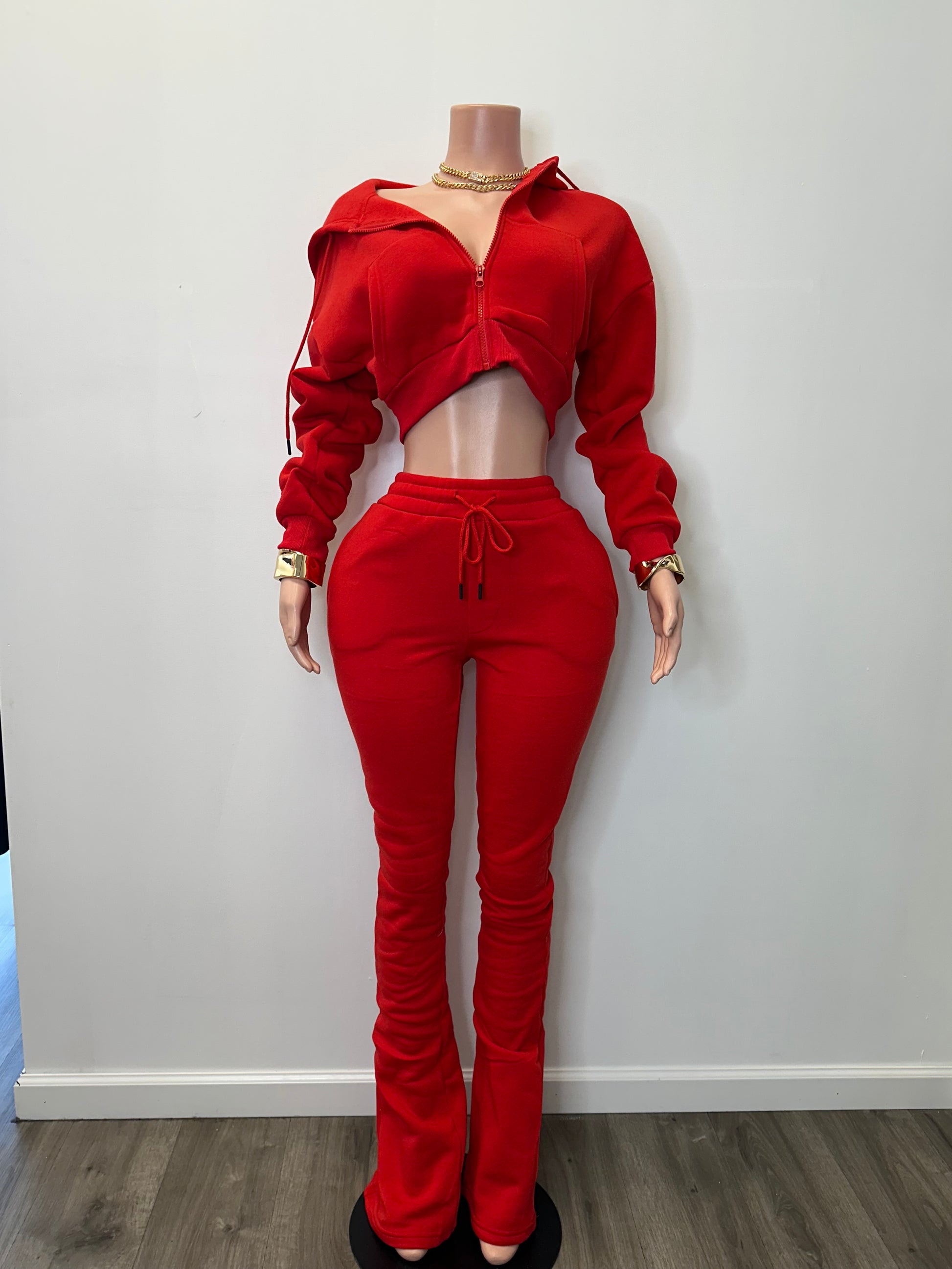 CROP HOODIE ZIP UP & LONG STACKED PANTS.