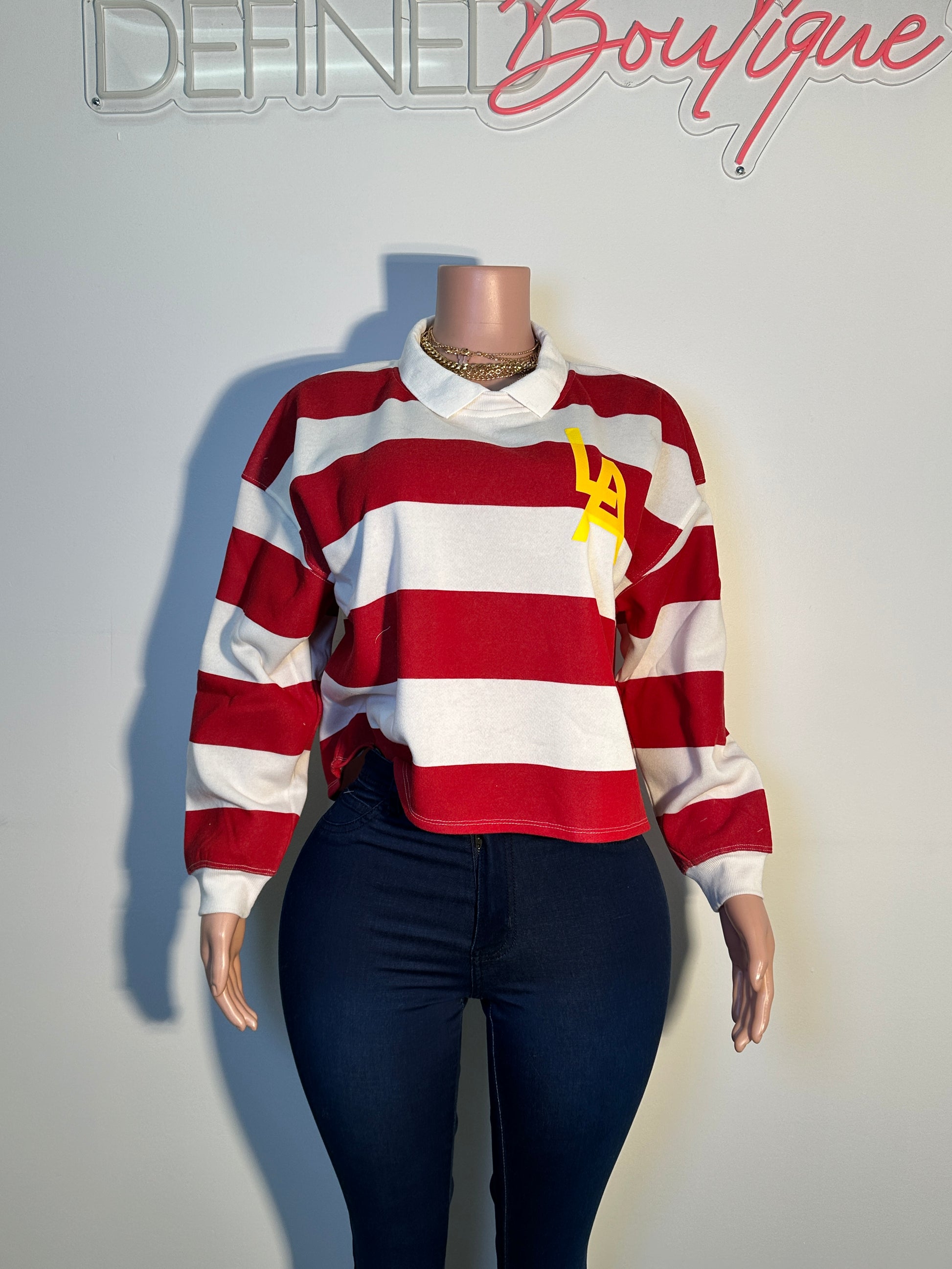 LONG SLEEVE PRINT DETAIL STRIPED POLO SWEATSHIRT